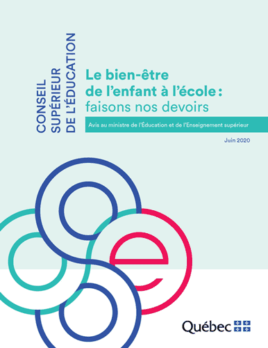 Ouvrage entièrement consacré à la thématique du bien-être à l’école et s’inscrit dans les valeurs, les orientations et les actions prônées depuis longtemps par le Conseil supérieur de l’éducation. Le document dresse le portrait de la situation des enfants au Québec et définit les bases conceptuelles du bien-être. Au cœur de l’avis se trouvent, dans une perspective écosystémique, les différents facteurs de risque et de protection qui influencent le bien-être à l’école. Les compétences sociales et émotionnelles des enfants et des adultes y occupent une place particulière. À l’issue de sa réflexion, le Conseil formule dix-huit recommandations, dont la première est à l’intention des enfants.